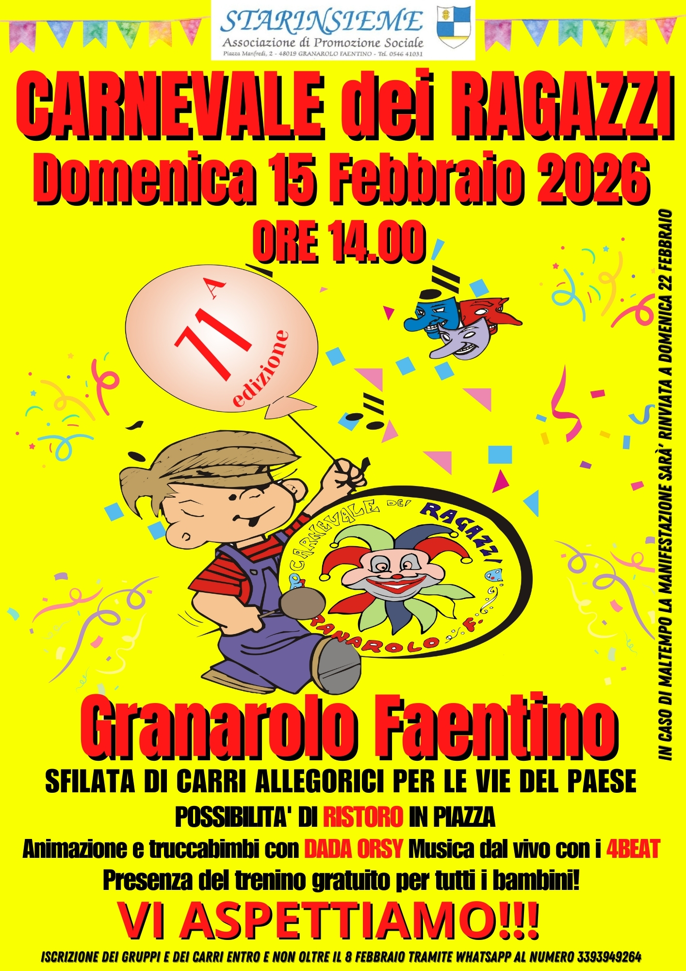 Da quasi settant'anni a Granarolo Faentino il Carnevale è la festa più attesa da tutti i bambini, quelli del paese e non soltanto. Attira infatti immancabilmente anche tante persone da fuori il Carnvevale dei Ragazzi, da sempre organizzato proprio nelle giornate centrali del Carnevale e che da tempo è organizzato dall'associazione Starinsieme. La festa, nella domenica di Carnevale, prevede sfilate di carri e gruppi mascherati per le vie del paese, oltre alla premiazione delle maschere più belle e più simpatiche.